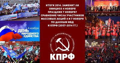Аналитики ЦИПКР и Отдела по информационно-аналитической работе и проведению выборных кампаний ЦК КПРФ проанализировали официальные статистические данные КПРФ и МВД РФ по количеству участников массовых акций 7 ноября в честь Великого Октября за период с 2007 по 2014 гг., т.е. за период, когда день годовщины Великой Октябрьской социалистической революции утратил статус праздничного и выходного, стал обычным рабочим днем.