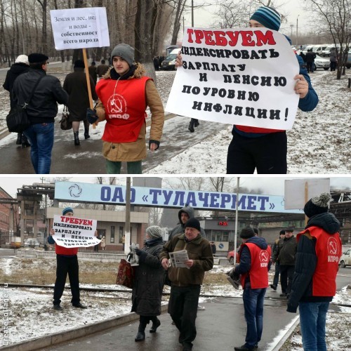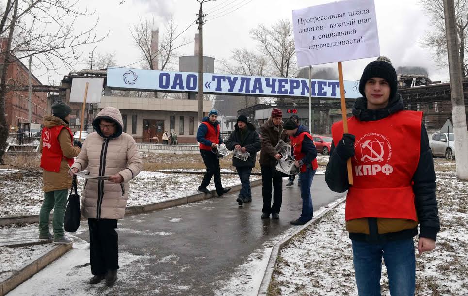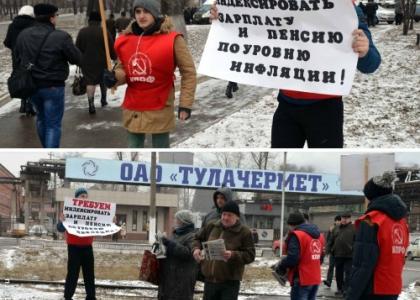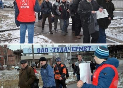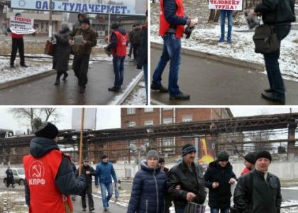 Тульские коммунисты в рамках Всероссийской акции протеста против неэффективной государственной социально-экономической политики, проводимой Правительством РФ, в течение последней недели провели серию массовых пикетов у проходных крупных заводов.