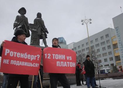 "Валите Платон, а не то он завалит нас!", "Ротенберг? Не подавишься?", "Нас миллионы, и мы против!", "Да всероссийской стачке дальнобойщиков!", "Нет правительству олигархов!", "Нет новым поборам!", "Система "Платон" поднимет цены на товары!", "Хватит душить народ!", "Люди важнее прибыли!", "Перекрутите гайку, резьбу сорвет!", "Нет дорожному распилу!", "Платон - это кража!", "12 ТОНН vs ПЛАТОН" - гласили плакаты, которые держали в руках возмущенные дальнобойщики.
