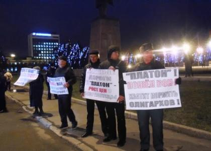 На площади, украшенной кумачом флагов и транспарантов КПРФ, собрались активисты КПРФ и водители-дальнобойщики с плакатами: "Дальнобойщики – не дойная корова!", "Платные дороги – это отсутствие продуктов в магазинах!", "Не хотим кормить Ротенбергов!", "Дальнобойщики против "Платона!" и др.