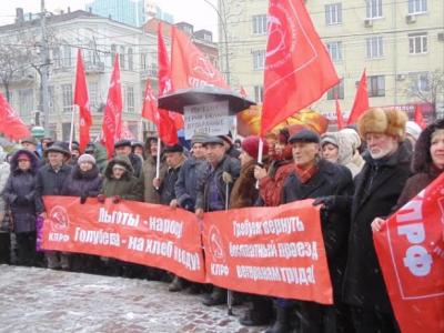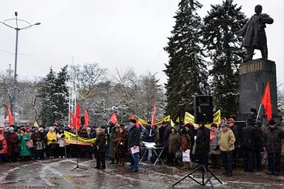 Митинг в рамках всероссийской акции протеста в Ростове-на-Дону несмотря на нулевую температуру, непрекращающийся снегопад и почти недельную активность средств массовой информации, призывавших ветеранов труда не участвовать в митингах коммунистов, собрал возле памятника В.И. Ленину на Большой Садовой около тысячи участников.