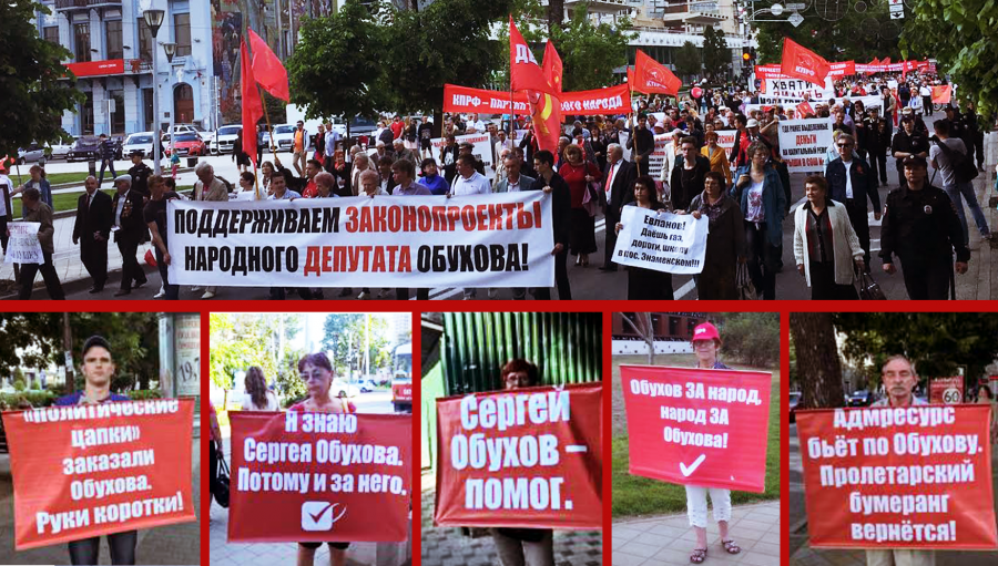 Основными лозунгами пикетирующих стали: «Политические цапки заказали Обухова», «Нам нужен настоящий народный депутат», «Админресурс бьет по Обухову. Пролетарский бумеранг вернется», «Наведите элементарный порядок на выборах: верните Обухова в список КПРФ!» и другие.