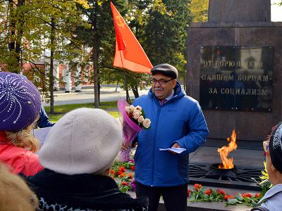- Традиционно в этот день мы собираемся у этого памятника, который поставили в свое время барнаульские коммунисты в честь погибших своих предшественников. Мы должны всегда помнить тех, кто устанавливал Советскую власть на Алтае, кто погиб, борясь за нее в годы гражданской войны. Те люди воспитали следующее героическое поколение, которое строило и защищало Советский Союз. Да, сейчас у нас отняли нашу родину – Советский Союз. Мы живем в России, но каждый год приходим к этому памятнику, построенному во времена СССР. В октябре 1993 года в Москве погибли защитники советской Конституции. Они погибли уже в годы капитализма.