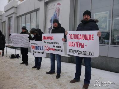 Рабочие и коммунисты областной организации КПРФ держали в руках плакаты с надписями "Руководство КИНГКОУЛ - к ответу", "Голодающие шахтеры - позор Президенту", "Шахтёр! Не верь, не бойся, не проси. Требуй своего".
