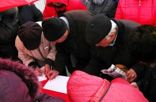 Несмотря на моросящий дождь, временами переходящий в снег, и пронизывающий ветер, на площади бойко шел сбор подписей за отставку губернатора В.Радаеваи председателя избирательной комиссии П.Точилкина, за придание 7 ноября статуса государственного праздника.