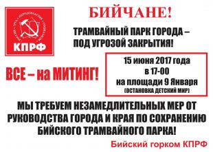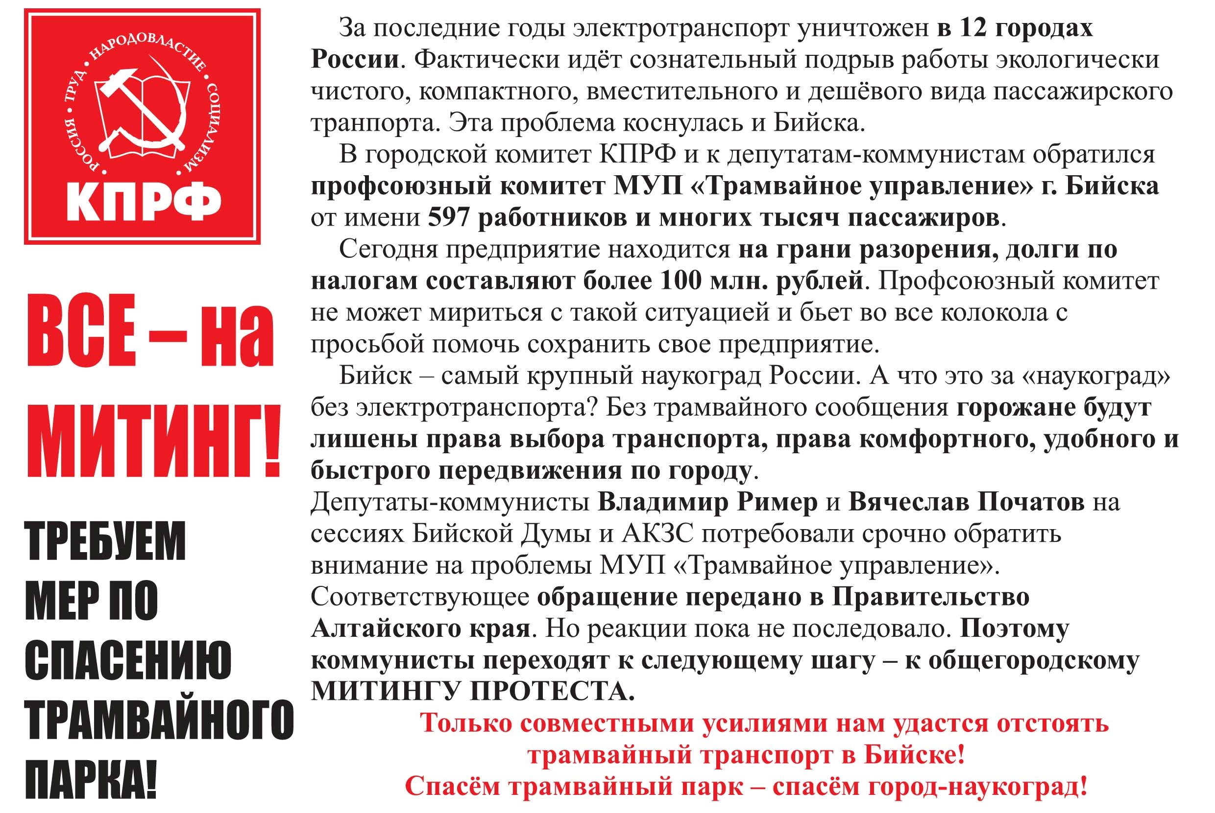 В Бийский городской комитет КПРФ, депутатам от фракции КПРФ в Думе Бийска и в Алтайском краевом Законодательном Собрании обратился профсоюзный комитет МУП г. Бийска «Трамвайное управление» - от имени 597 работников и многих тысяч пассажиров, которых они перевозят ежегодно.