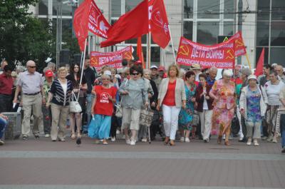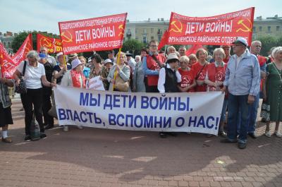 Митинг открылся выступлением первого секретаря Санкт-Петербургского горкома КПРФ, члена Президиума ЦК, руководителя фракции КПРФ в Законодательном Собрании Санкт-Петербурга О.А. Ходуновой. Ольга Архиповна подчеркнула, что поколение «детей войны» по праву является гордостью нашего народа, поскольку именно представители этого поколения не только восстанавливали народное хозяйство страны после разрухи, но многие из них также ковали победу в тылу. Именно это поколение оказалось сегодня наиболее обделенным, поскольку антинародная власть всеми силами отказывается от признания заслуг «детей войны». Возмущенные фактами игнорирования правительством нужд и чаяний простых граждан и махинациями при исчислении льгот и индексации пенсий, которые привела О.А. Ходунова, участники митинга долго скандировали «Позор!».