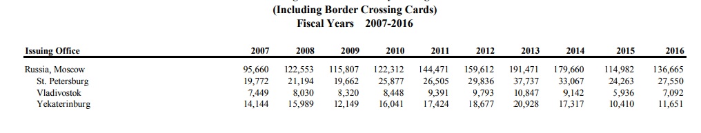 Интересна и статистика, упомянутая в обращении ДИП МИД РФ: «В то время как, например, 16 консульских сотрудников Италии обработали в прошлом году 478 тысяч визовых запросов, а 5 их испанских коллег-дипломатов выписали россиянам 877 тысяч виз, в разы больший штат консульств США смог «осилить» лишь около 186 тысяч».