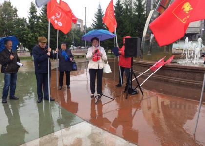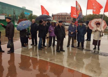 Несмотря на сильный дождь и на то, что в Тюмени не было выборов, на площади у рынка собрались члены КПРФ, чтобы выразить свой протест власти, которая всеми правдами и неправдами пытается отодвинуть коммунистов на обочину политической жизни области.