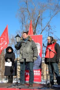 "Мы подавали заявку на проведение митинга на пр. Ленина. Наша власть загоняет нас специально на окраину города. Сегодня ночью администрация полностью завесила забор сквера Родина транспарантами, чтобы никто с улицы не видел, что здесь проходит митинг. Всеми правдами и неправдами власть работает на то, чтобы оболгать нас. Товарищи, давайте отстаивать наши права! Именно в этом году, 18 марта, мы сможем вернуть Россию на рельсы социалистического развития. Следующий митинг состоится 17 февраля 2018 года в 12.00. О месте его проведения объявим дополнительно".