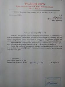 «В связи с обострением ситуации по мусорным полигонам в Подмосковье появляется информация о возможной проработке вопроса по использованию действующих и организации новых полигонов на территории Ярославской области для утилизации бытовых отходов с территории города Москвы и Московской области, — говорилось в обращении. — Фракция КПРФ в Ярославской областной Думе считает недопустимым кулуарного принятия каких-либо решений по этим жизненно важным вопросам. Прошу Вас сообщить информацию о фактическом положении дел для дальнейшего вынесения фракцией указанного вопроса на рассмотрение Ярославской областной Думы».