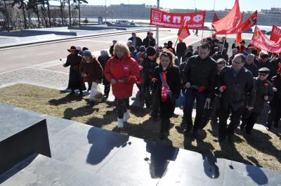 После завершения митинга руководство городского отделения партии вместе с представителями партийного и комсомольского актива возложило цветы к подножию монумента В.И. Ленина.