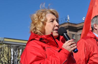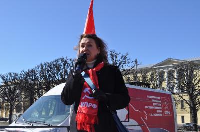Открылся митинг выступлением первого секретаря Санкт-Петербургского горкома КПРФ, руководителя фракции КПРФ в Законодательном Собрании Санкт-Петербурга, члена Президиума ЦК партии О.А. Ходуновой, которая особое внимание уделила результатам выборов Президента Российской Федерации, состоявшихся 18 марта 2018 года. Она отметила, что несмотря не беспрецедентное давление на нашего кандидата П.Н. Грудинина, на уже набивший оскомину административный произвол, на гнусную вакханалию в прорежимных СМИ, на махинации в день голосования, миллионы граждан отдали свои голоса за курс созидания и социального оптимизма, в очередной раз доказав, что только коммунисты способны предложить альтернативу капиталистическому загниванию. «Только полной сменой курса, только формированием нового ответственного правительства народного доверия мы сможем остановить дальнейший рост тарифов, повышение налогов, прекратить нападки на последние социальные завоевания Советской власти», - подчеркнула Ольга Архиповна.