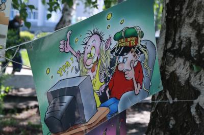 красная палатка, коммунисты развесили плакаты, лозунги, карикатуры. К палатке