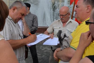 идет пикет, участники активно подписывают петицию против пенсионной реформы.
