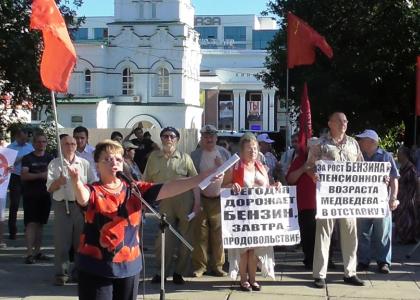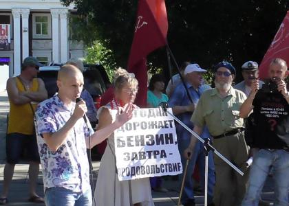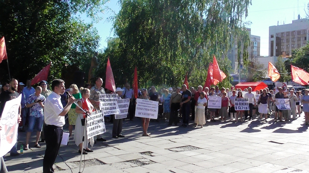 4 июля в Саратове прошёл очередной митинг против повышения пенсионного возраста, роста цен на бензин, а также увеличения тарифов на ЖКУ, ОСАГО и НДС, организованного местным отделением КПРФ. Он стал вторым «разогревающим» митингом перед всероссийской акцией протеста КПРФ.
