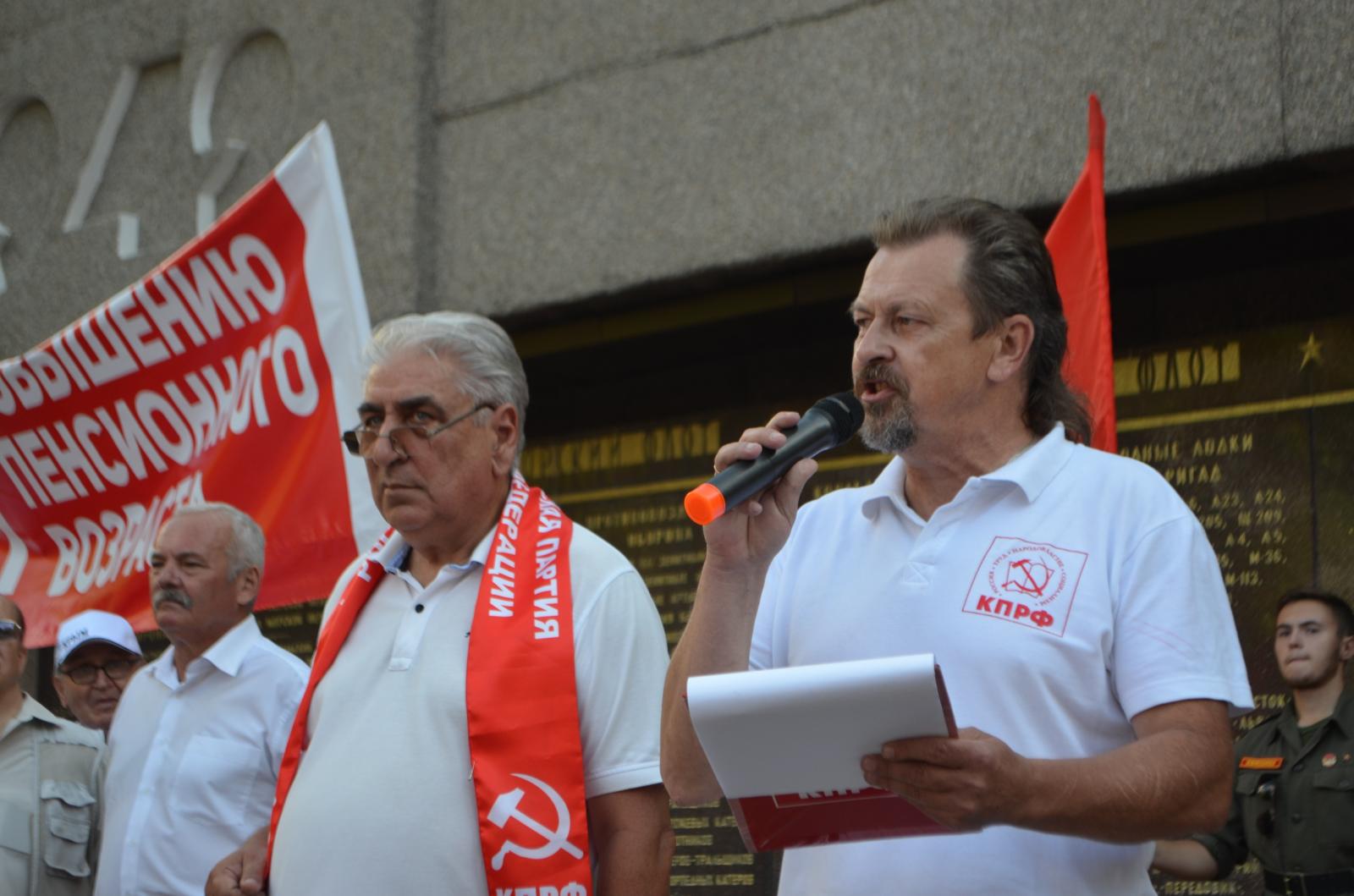 Открыл митинг Первый секретарь Городского комитета КПРФ Василий Михайлович Пархоменко. «Россия переживает непростое время. Нарастает социально-экономический кризис. Кульминацией наступления на права и интересы народа стала пенсионная реформа. Более подлого «подарка» для миллионов людей представить было сложно. Мы выражает твёрдый и решительный протест преступной реформы. Повышение пенсионного возраста позволит властям сэкономить около 1 триллиона рублей — и ради этих денег в жертву приносятся интересы и даже жизни миллионов людей. В то же время у Правительства имеется возможность пополнить бюджет за счёт непомерных доходов олигархов, банков и госструктур, за счёт пресечения воровства из бюджета страны», — отметил Василий Михайлович в своём выступлении.