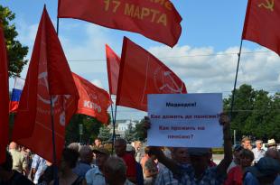 20 июля в Севастополе прошёл общегородской митинг против повышения пенсионного возраста мужчинам до 65 лет, женщинам до 63. Митинг организовал Севастопольский городской комитет КПРФ, в митинге приняли участие севастопольцы, ленинский комсомол, женская организация «Надежда России», Союз Советских офицеров, представители разных политических партий.