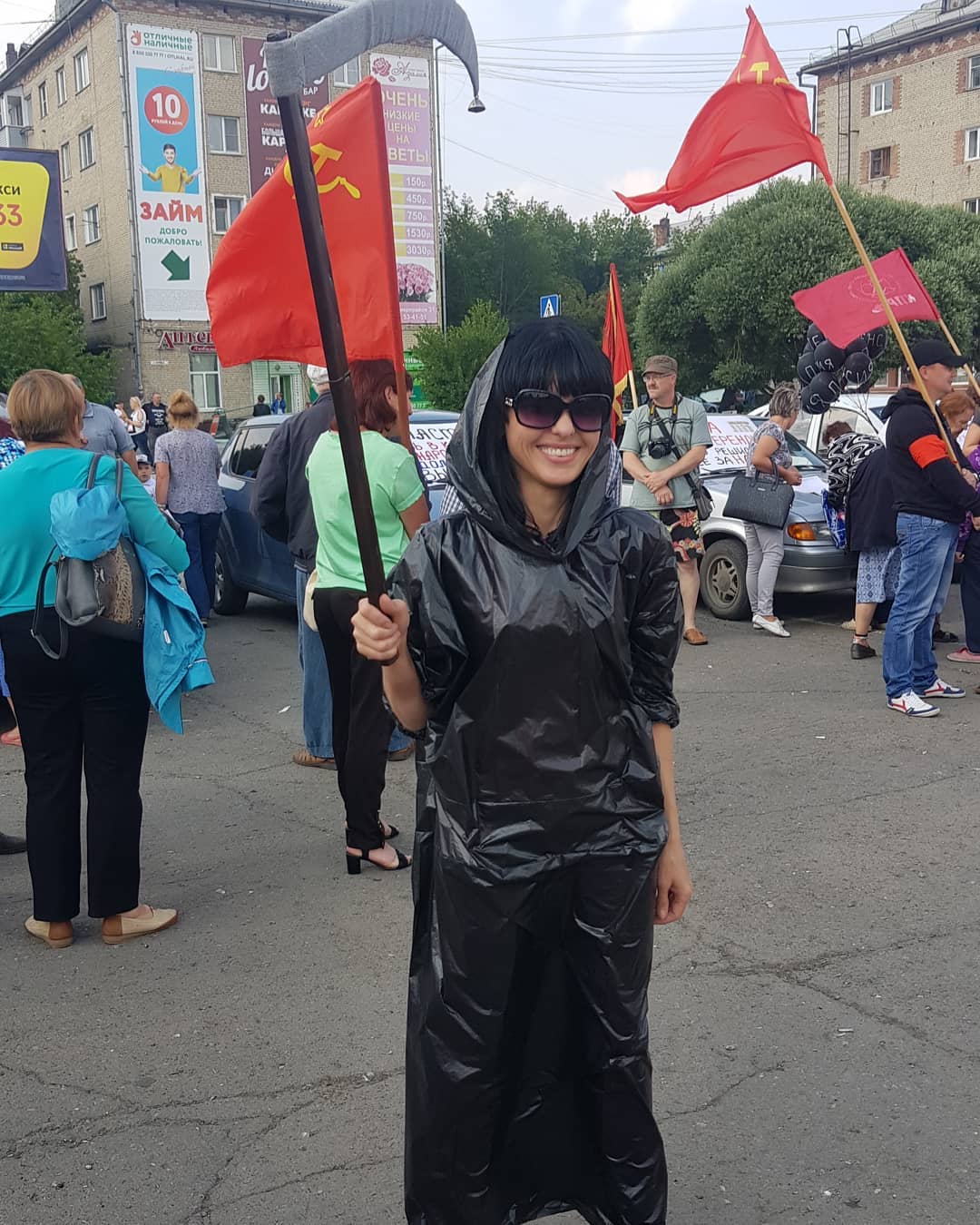 появилась девушка с косой и в черном облачении. На спине у нее было написано: