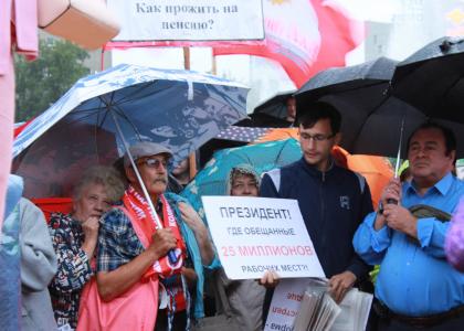Не менее полутысячи иркутян вышли 26 июля протестовать против возможного повышения пенсионного возраста. Под ливнем и сильным ветром участники митинга держали плакаты и громко поддерживали ораторов.