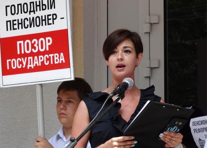 Председатель КРО ООО «Надежда России» Анжелика Данилова, выступая, отметила, что женщина не должна, да и физически не может работать до 63 лет. Она должна воспитывать детей, помогать внукам. Депутаты Госдумы от «Единой России» в Курске избрались и уехали в столицу, забыв о своих обещаниях. Выступающая предложила «гнать их в шею» - выразить всеобщее недоверие. Ее очень активно поддержали митингующие – аплодировали все присутствующие на площади.