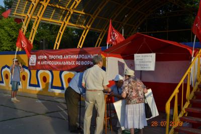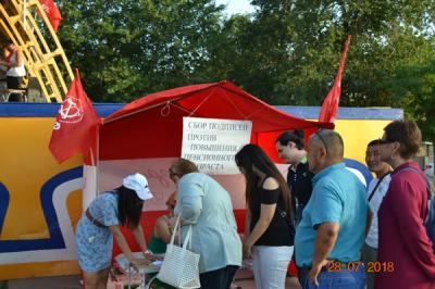 28 июля в Элисте, на площади Победы, несмотря на сильную жару (столбик термометра поднимался в шесть часов вечера выше 40 градусов), коммунисты Калмыцкого республиканского отделения КПРФ провели митинг против пенсионной «реформы» правительства. Митинг был организован в рамках Всероссийской акции протеста и проходил под лозунгом: «Нет – пенсионной реформе!».