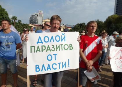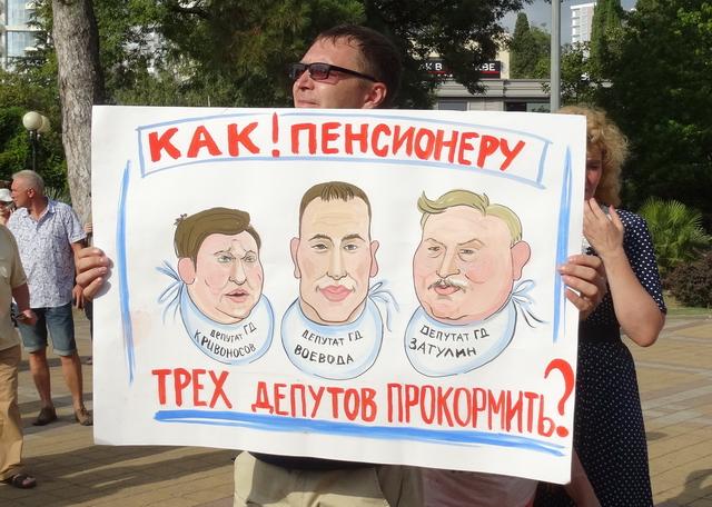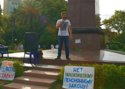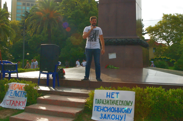 Митинг против намерений Правительства РФ и партии «Единая Россия» повысить пенсионный возраст прошёл в городе-курорте Сочи 28 июля с 17:00 до 18:30 часов. Послеобеденное время было выбрано организатором для того, чтобы не подвергать митингующих людей пытке под палящим солнцем на открытой площади.