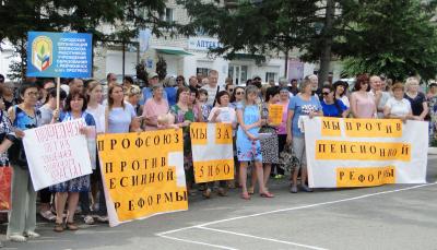 28 июля в Амурской области состоялись акции протеста в 11 городах и районах области. На митинги КПРФ вышло более 4000 человек. Мероприятия прошли под едиными требованиями: Нет пенсионной реформе, правительство в отставку, Путина ‒ на пенсию, на выборах ни одного голоса единороссам и их близнецам: ЛДПР, справедливороссам! К протесту КПРФ присоединились другие общественные объединения: обманутые вкладчики фирмы-банкрота «Россия», векселедержатели Азиатско-тихоокеанского банка, профсоюз работников образования.