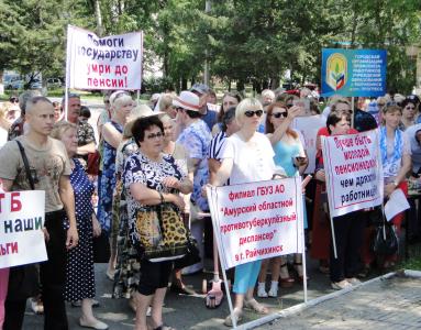 Всероссийская акция протеста КПРФ охватит практически всю Амурскую область. Протестные мероприятия в Приамурье стартовали еще 25 июля митингом в селе Поярково. 27 июля около тысячи благовещенцев сказали нет повышению пенсионного возраста. В августе состоятся митинги КПРФ в п. Тамбовка, г. Шимановск, г. Сковородино, пгт. Серышево.