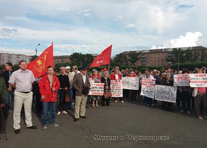 Черногорск. В Черногорске на митинг собралось более 700 человек. Среди собравшихся более половины – молодежь, чьи интересы ущемлены прежде всего. Черногорцы пришли на митинг семьями, с маленькими детьми. Вел митинг секретарь горкома Черногорска Виктор Кряжев. Первым выступил первый секретарь черногорского отделения КПРФ Петр Синьков, он выдвинут кандидатом в Верховный Совет Хакасии от КПРФ. Своим ярким выступлением он задал настроение всей акции протеста. На митинге выступили секретарь комитета КПРФ по протестному движению Оксана Разварина, депутат Верховного Совета Евгений Молостов, который также намерен бороться за мандат народного избранника в новом созыве парламента республики, коммунисты Владимир Грудинин, Андрей Кондратьев, неравнодушные жители Черногорска. Все выступления были пронизаны негодованием к правительству страны и партии власти. Все ораторы говорили, что чиновники, депутаты и прочие служащие, поддержавшие и продолжающие поддерживать законопроект о повышении пенсионного возраста, достойны народного суда. Высказанная критика в адрес власти, правительства и партии «Единая Россия» вызывала бурное одобрение людей, а лозунг: «Правительство в отставку! Ни одного голоса партии власти на выборах!» был подхвачен каждым последующим оратором.