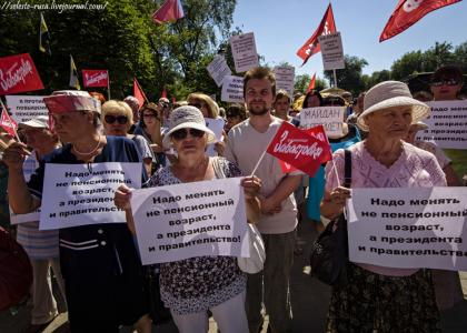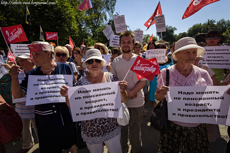 Люди пришли с плакатами и транспарантами "Пенсионная реформа-геноцид народа", "Надо менять не пенсионный возраст, а Правительство", "Власть лезет в карман народа", "Мы не рабы!", "Нам нужен референдум!", "Нет повышению пенсионного возраста", "Руки прочь от наших пенсий" и многими другими.