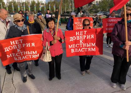 В Якутске на площади Дружбы 3 сентября с.г. состоялся митинг против повышения пенсионного возраста. Первый секретарь Якутского рескома КПРФ Виктор Губарев, открывая его, напомнил решение, принятое на предыдущем массовом сходе населения, а это было 28 июля, — не прекращать акции протеста до тех пор, пока не будет выполнено требование граждан — остановить, как их окрестил народ, людоедскую реформу. Сегодня коммунисты также выдвигают лозунг «За честные и чистые выборы!».