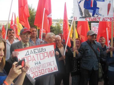 4 сентября в Ярославле, в парке Мира, прошел второй общегородской митинг против повышения пенсионного возраста, организованный областной организацией КПРФ.