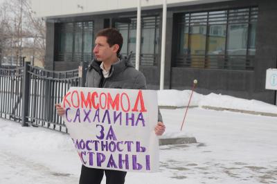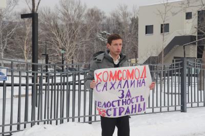 "День северных территорий", который отмечают ультраправые силы Японии 7 февраля, стал поводом для проведения одиночных пикетов в Южно-Сахалинске. Молодые парни, члены сахалинского отделения ЛКСМ вышли на улицу с плакатами в знак протеста против передачи части островов Курильской гряды японской стороне.