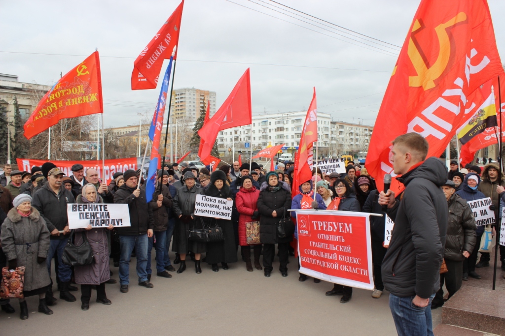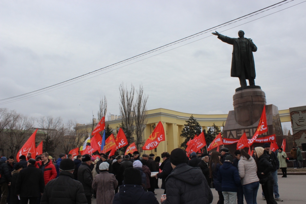 В субботу, 16 марта, на площади Ленина Центрального района города Волгограда более 500 человек собрались на митинг в защиту социально-экономических прав граждан, организованный по инициативе Сталинградского обкома КПРФ. Поддержать коммунистов помимо жителей Волгограда, собрались активисты Союза Советских офицеров, Движения в поддержку армии, ЛКСМ РФ, ВЖС "Надежда России", "Дети войны", движения "Левый фронт" и многие другие общественно-политические объединения города и области.