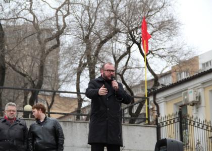 Свое обращение к собравшимся на площади людям он начал со следующих слов: «Уважаемые товарищи! Социально-экономическая ситуация в стране и крае только ухудшается, она не растет и не развивается. Сегодня, когда в стране фактически идет геноцид населения, повышаются налоги, растут цены, повышен пенсионный возраст – это власть делает все для того, чтобы довести население до гражданской войны». Также лидер приморских коммунистов высказал принципиальную позицию партии по вопросам проведения антинародной политики правительства: «Эти негодяи, сидящие в Центризбиркоме, правительстве, на министерских креслах, на мой взгляд, хотят лишь одного – раздробления нашей общей страны – России. Последнее решение Центральной избирательной комиссии, принятое позавчера – не передать депутатский мандат покойного Жореса Алферова бывшему кандидату в Президенты РФ Павлу Грудинину, является очередным тому доказательством. Как можно по надуманному поводу отказаться передавать возможность представлять мнение и интересы людей в российском парламенте человеку, которому 8,5 миллионов граждан России были готовы доверить управление государством?»