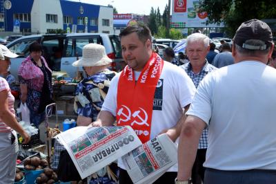 Среди агитаторов, которые отправились с газетами по рынку, один из самых эффективных пропагандистов, работающих в социальных сетях, коммунист Игорь Прыгун. Его Инстаграмм собрал уже десятки тысяч подписчиков, а пишет Игорь не «о котиках». Но и в офф-лайне он не менее активен: