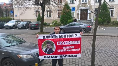 Сегодня в Калининграде у здания Калининградской областной Думы, у монумента «Мать-Россия», а также в г. Славске прошли одиночные пикеты коммунистов в защиту бывшего кандидата в президенты от КПРФ, руководителя знаменитого предприятия «Совхоз им. Ленина» Павла Грудинина.