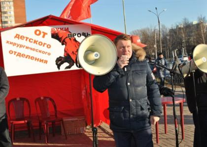 «Начавшаяся 10 лет назад «оптимизация» учреждений здравоохранения Нижегородской области уже нанесла непоправимый вред всей сфере оказания медицинской помощи населению области. В деревнях и селах области массово ликвидировали отделения первичной медицинской помощи и фельдшерско-акушерские пункты. В 21 веке немыслимо об этом говорить, но зачастую роженицам приходится преодолевать расстояния на 60-80 километров на ближайшего отделения больницы, чтобы получить базовую медицинскую помощь. Теперь очередь дошла и до областного центра. Допустить закрытие отделения детской хирургии, единственного на крупный промышленный район города – это безрассудное решение. Нельзя этого допустить. Вся сфера здравоохранения области находится в глубочайшем кризисе. На данный момент задолженность фонда обязательного медицинского страхования перед поликлиниками и больницами более 500 миллионов рублей, а важнейшие статьи областного бюджета, направленные на обеспечение льготных категорий граждан лекарственными средствами, оказываются недофинансированными. КПРФ заявляет решительный протест политике действующей власти, направленной на упразднение учреждений здравоохранения в Нижегородской области. Хватит экономить на здоровье наших детей!» - выступил перед собравшимися первый Секретарь Комитета НРО КПРФ Владислав Егоров.