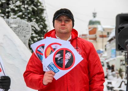— В прошлом году, когда здесь, в Томске, 2 тысячи человек вышли на улицы против пенсионной реформы, об этом не показали ни одного сюжета по государственным каналам! Зато сейчас на всю страну крутят супер-новость о том, что коммунист Коновалов отменил в Абакане ёлку! И это всё делается на наши налоги!