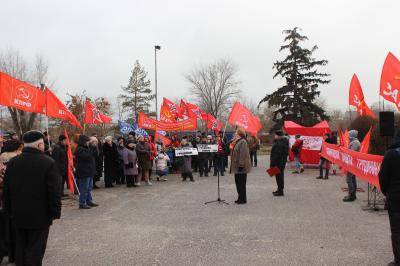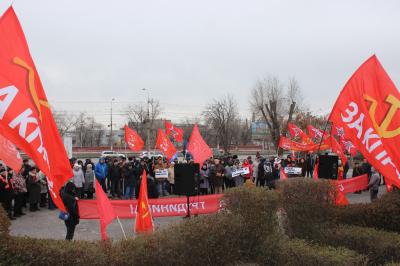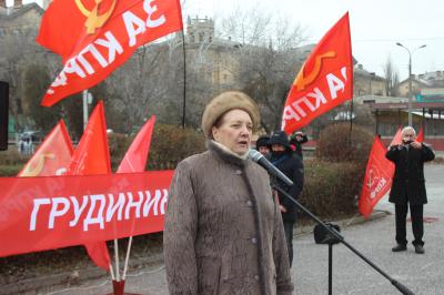 "Уважаемые товарищи, дорогие волгоградцы, накануне праздничных дней, коммунисты области и всей страны вновь вышли на улицы и площади городов с тем, чтобы выразить свое несогласие, возмущение ситуацией, которая сложилась в стране. Развальные реформы дают право осознать всем, что оказывается, советский образ жизни с его социальной защищенностью и надежностью привлекает к нам все больше сторонников: учителей, врачей, ученых, молодежь, ветеранов. Сегодня они вместе с нами протестуют против того, что сделали с нашей страной правители-либералы, - обратилась к собравшимся, открывая митинг, Первый секретарь Сталинградского обкома КПРФ, руководитель фракции КПРФ областной думы Тамара Головачева. - Опрос общественного мнения показал, что 93% россиян недовольны обстановкой в нашем государстве и очень хотят вернуть социалистические ценности, а более 30% волгоградцев желают покинуть Волгоград. Печальная статистика говорит о том, что в Воронеже насчитывается 11% бедных, в Астрахани - 38%, а в Волгограде - более 50. Вот почему коммунистическая партия вместе со всем народом вышла на защиту социальных прав трудящихся, граждан нашей страны и руководителей-коммунистов: Левченко, Локтя, Грудинина, Бессонова и многих других, в том числе из Волгоградской области, - продолжила лидер Сталинградских коммунистов. - Непросто сегодня и депутатам фракции КПРФ областной думы: 33 человека против пятерых депутатов-коммунистов. И все-таки борьба продолжается. За два с половиной месяца наша фракция получила более полутора сотен обращений граждан на нерадивых чиновников, на их грубость, невнимание и нарушение закона. Состоялись два десятка выездов, встреч с избирателями в районах Волгоградской области, которые организовывали депутаты-коммунисты областного парламента. Коммунисты голосовали против принятия бюджета региона, поскольку он имеет антисоциальную направленность. Они также были против повышения налоговых поборов. А эта принципиальная позиция, в свою очередь, конечно же не устраивает партию власти. Не нравятся властям и наши руководители-коммунисты, их злит порядок в Иркутской области, который губернатор Сергей Левченко навел на всех промышленных предприятиях, не нравится директор совхоза имени Ленина Павел Грудинин. Не устраивает власть тот факт, что даже при кризисе и при санкциях можно работать на благо граждан и во благо идеи социальной справедливости. Следовательно, по этой причине против коммунистов развернута масштабная информационная война в СМИ, - продолжила руководитель фракции КПРФ областной думы. - Однако нас, коммунистов, не сломить. Нашей верой в Победу, нашим Красным знаменем является программа КПРФ "Десять шагов к достойной жизни". 15 лет, до Левченко, в Иркутской области не могли построить поликлинику, и только "красный губернатор" смог эту проблему разрешить. В Иркутской области не закрываются школы и поликлиники, не закрываются больницы - это лучший пример конкретных дел нашей партии, лучший пример претворения ее программы в жизнь. Поэтому сегодня мы требуем и предлагаем объединиться всем патриотическим силам, дать отпор лжецам, тем, кто в 90-е годы стоял с плакатом "долой коммунистов" и разваливал Советский Союз, а сегодня в социальных сетях публикует пасквили о том, что коммунисты - плохие, призываем объединиться против тех, кто лье