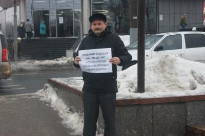 За будущее наших детей! Против строительства завода переработки опасных отходов в Марадыково! Под таким лозунгом вышел на одиночный пикет руководитель фракции КПРФ в Кировской Гордуме Алексей Вотинцев.