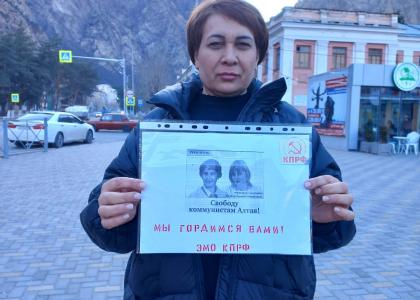 Коммунисты Эльбрусского местного отделения КПРФ провели в центре высокогорного города Тырныауза одиночные пикеты в поддержку коммунистов Алтая, которые по надуманному обвинению задержаны и подвергнуты аресту, - депутата-коммуниста краевого законодательного собрания от КПРФ Людмилы Клюшниковой и её помощника Светланы Кербер.