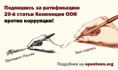 Мы, студенты и аспиранты Московского государственного университета имени М.В. Ломоносова и Российской академии народного хозяйства и государственной службы при Президенте Российской Федерации, призываем всех граждан России поставить свою подпись под обращением за ратификацию статьи 20 Конвенции ООН против коррупции, которое после сбора необходимых 100.000 подписей будет направлено Президенту, депутатам Госдумы и членам Совета Федерации.