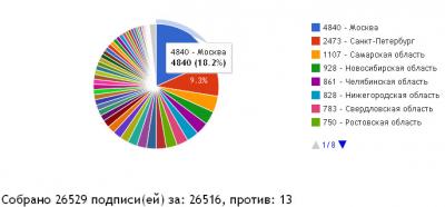 Как показывают, статистические данные о ходе сбора подписей более всего подписантов из Москвы – 4840 чел. и из Санкт-Петербурга - 2473. Далее следуют жители Самарской (1107), Новосибирской (928), Челябинской (861), Нижегородской (828), Свердловской (783), Ростовской (760), Омской (690) областей, Красноярского (663) и Пермского (661) краев. Волгоградской (650), Воронежской (584) областей, Краснодарского края (578), Кемеровской (526) и Саратовской (514) областей. Уже в 16 регионах собрано более 500 подписей. Регионов «тысячников» - 3.