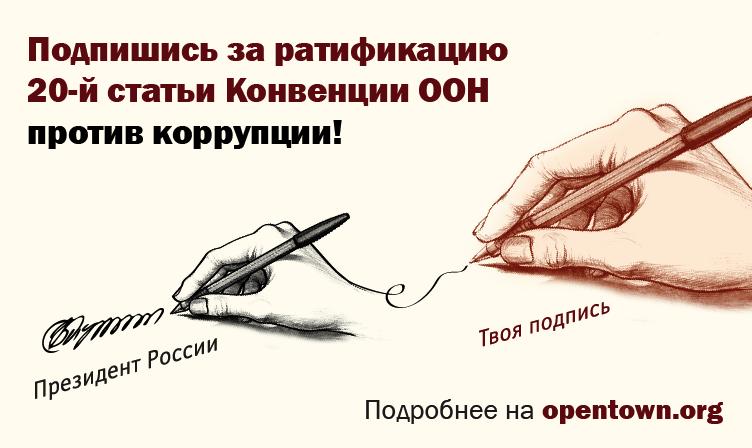 «Мы, студенты и аспиранты Московского государственного университета имени М.В. Ломоносова и Российской академии народного хозяйства и государственной службы при Президенте Российской Федерации, призываем всех граждан России поставить свою подпись под обращением за ратификацию статьи 20 Конвенции ООН против коррупции, которое после сбора необходимых 100.000 подписей будет направлено Президенту, депутатам Госдумы и членам Совета Федерации.