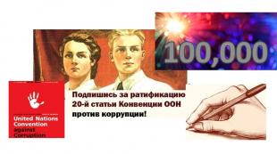 Кампания по сбору подписей в Интернете, фактически, развернулась с 21 января. Многие граждане России, которым не безразлична судьба Отечества, быстро откликнулись на призыв поддержать ратификацию 20 статьи Конвенции ООН против коррупции. И вот 11 февраля достигнут первый рубеж – собрано более 100.000 подписей.