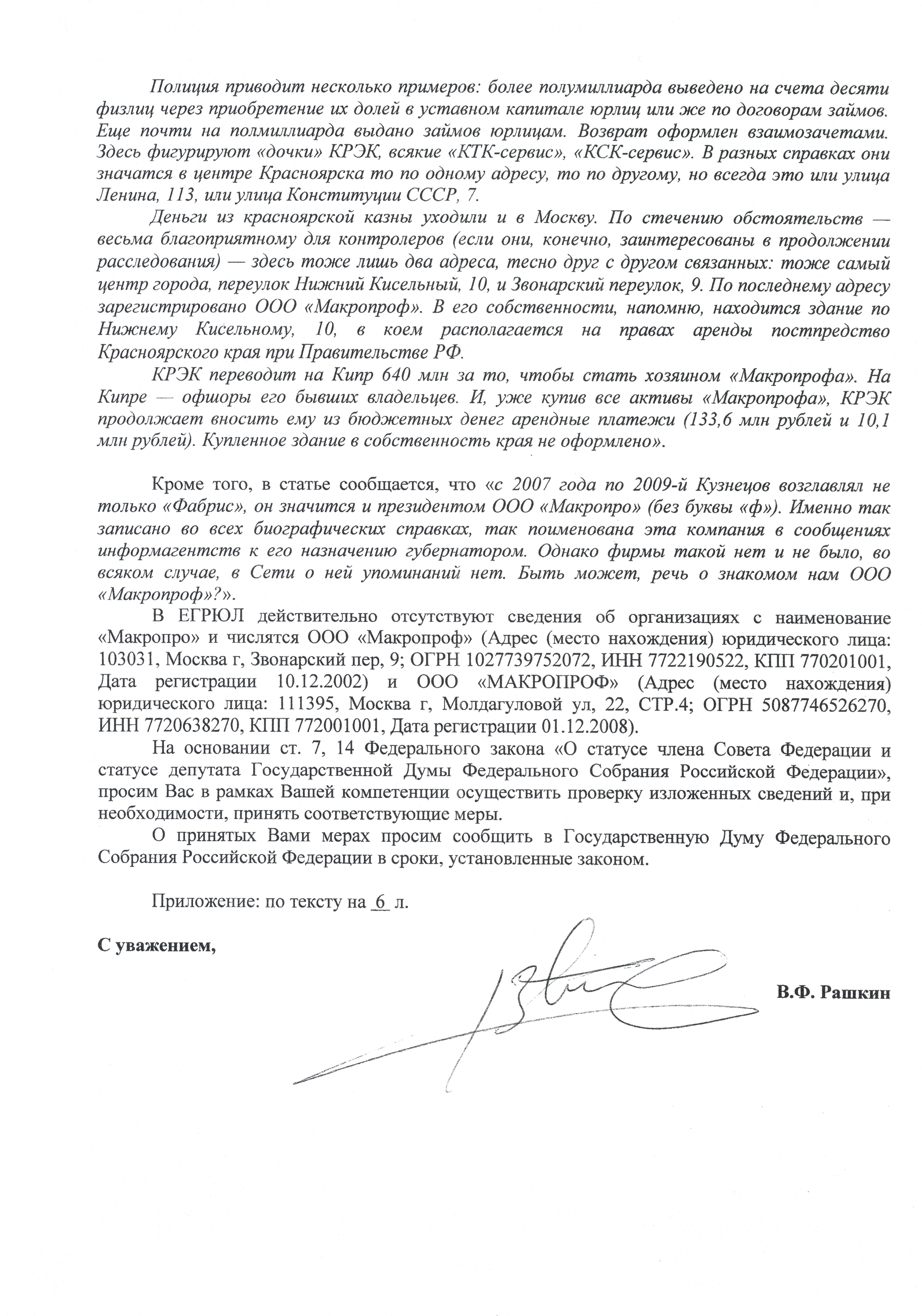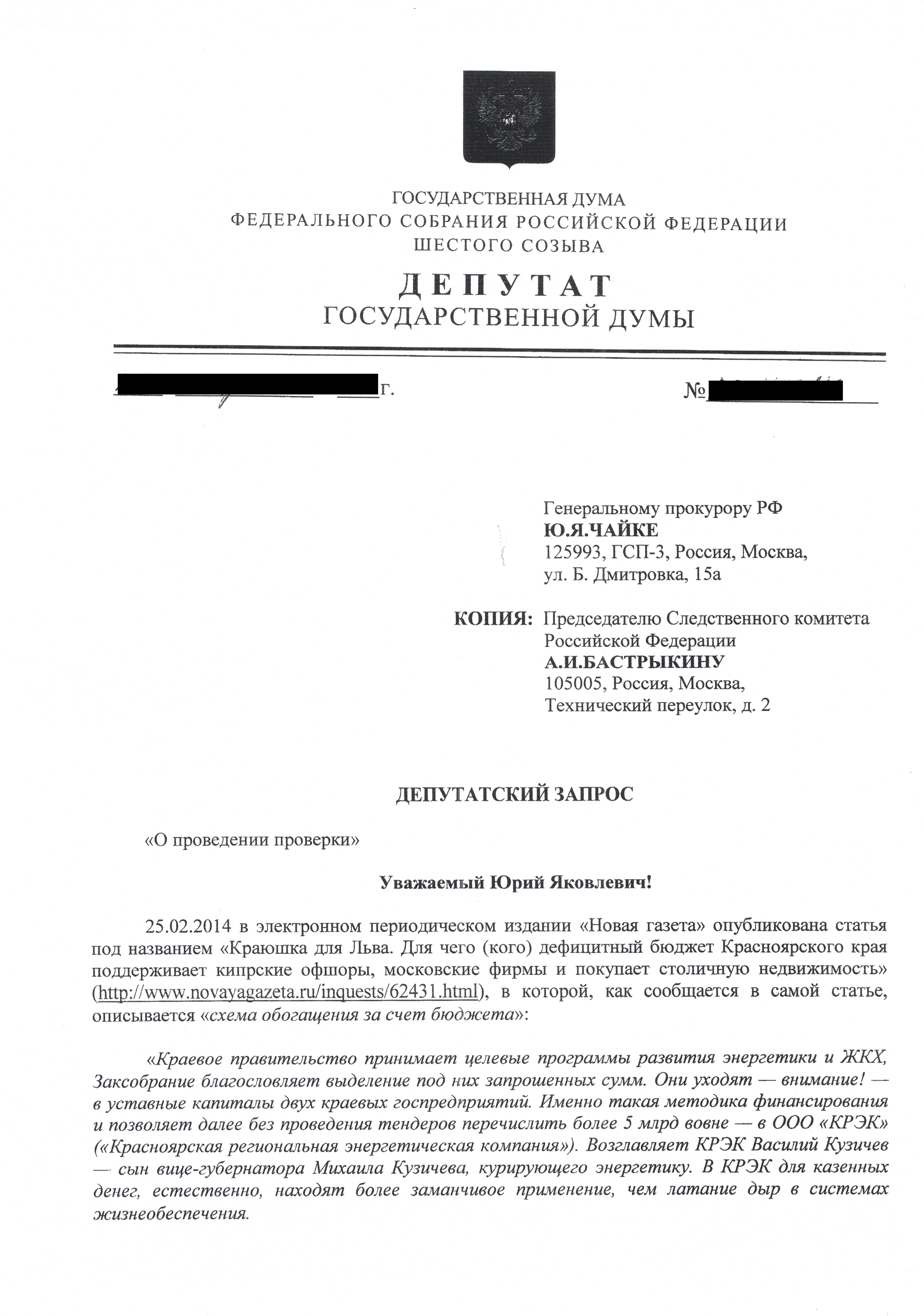 Депутаты Госдумы фракции КПРФ В.Ф. Рашкин и С.П. Обухов направили депутатский запрос Генеральному прокурору РФ Ю.В. Чайке и Председателю Следственного комитета РФ А.И. Бастрыкину с требованием принять необходимые меры по пресечению сомнительных схем в энергетике Красноярского края.