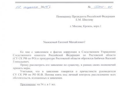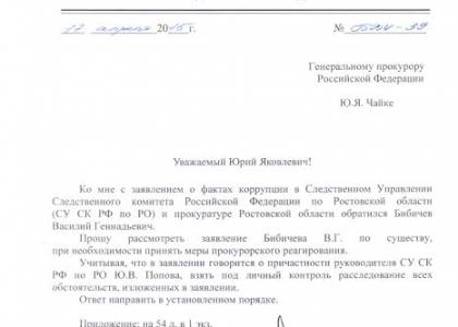 Депутат Госдумы В.И. Бессонов направил запросы генпрокурору РФ Ю.Я. Чайке, помощнику Президента РФ Е.М. Школову, Председателю Следственного комитета РФ А.И. Бастрыкину, директору ФСБ А.В. Бортникову. К депутату обратился бизнесмен Евгений Бибичев, который сообщил о коррупции в Следственном управлении Следственного комитета РФ по Ростовской области и прямой причастности к этому руководителя СУ СК РФ по РО Ю.В. Попова.