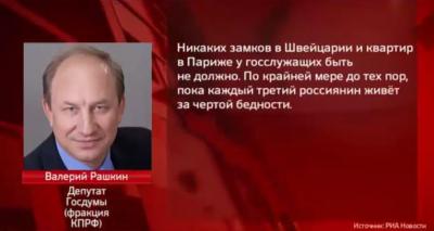 Рашкин всю среду не отвечал на звонки РБК. «Никаких замков в Швейцарии и квартир в Париже у госслужащих быть не должно. По крайней мере до тех пор, пока каждый третий россиянин живет за чертой бедности», — заявлял ранее он.